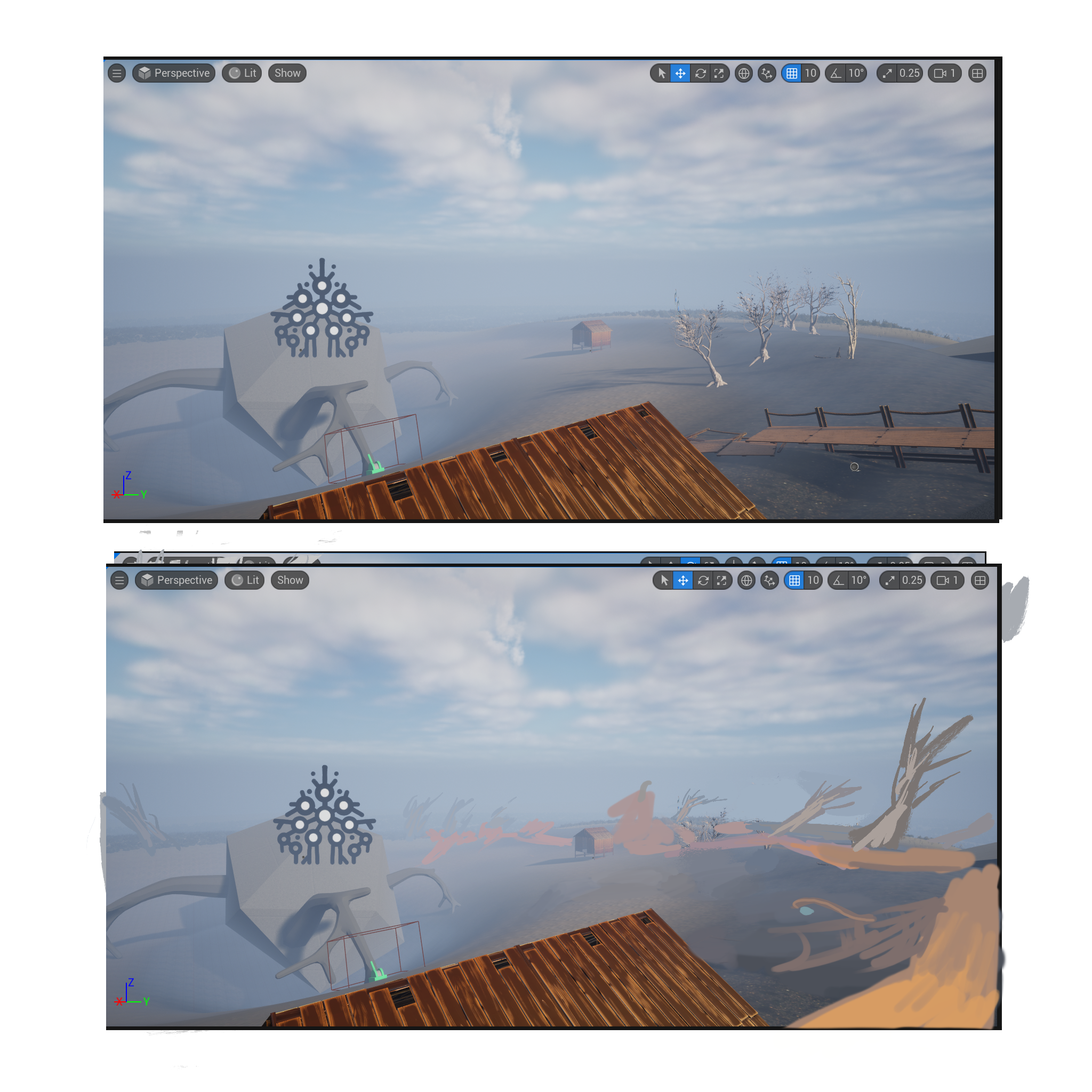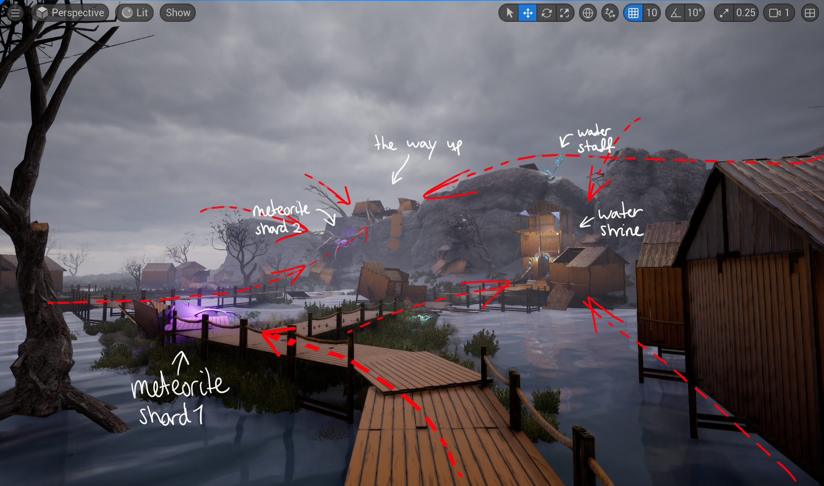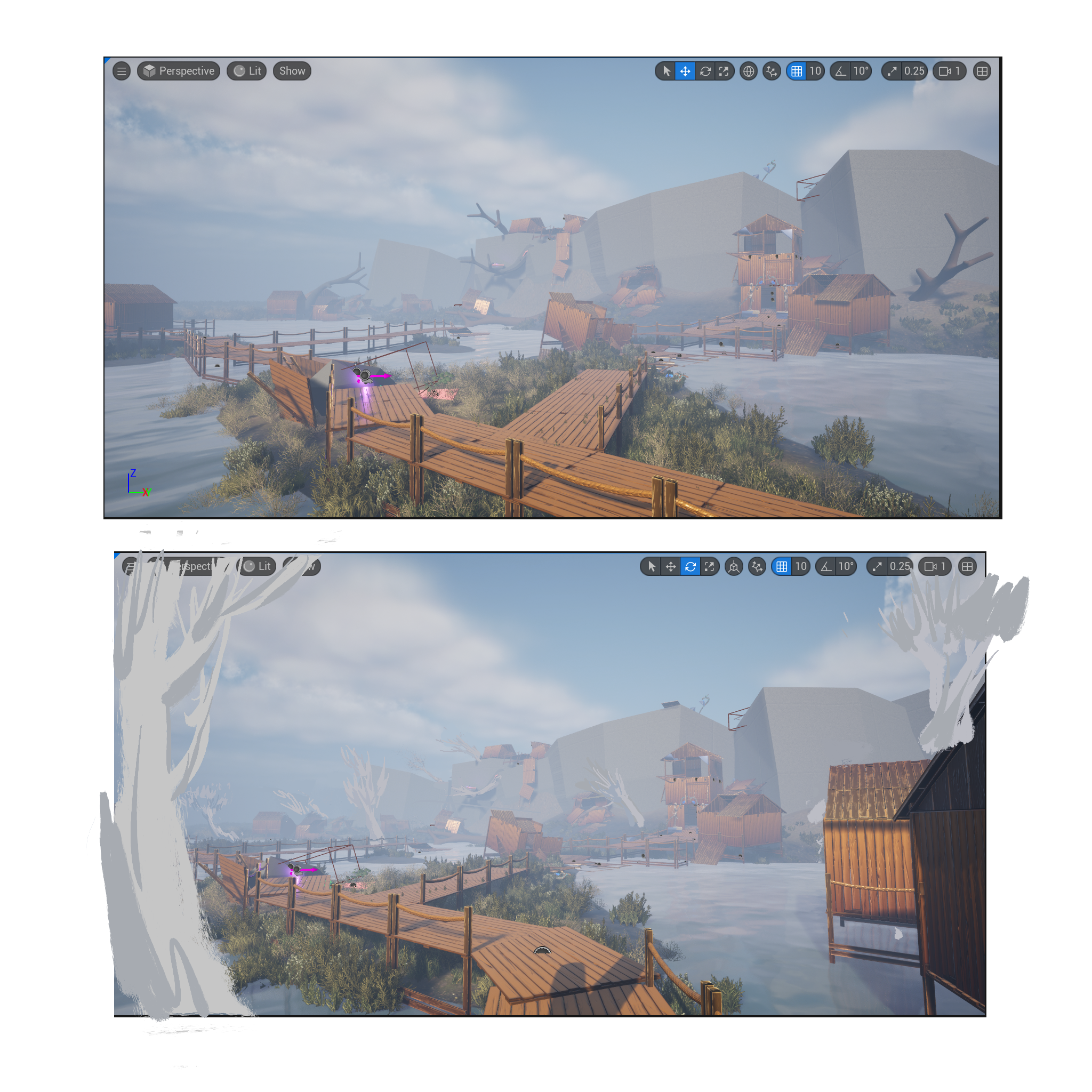 I overpainted a key game screenshot to analyze the image from a 2D perspective (allows for better overview of leading lines), and changed parts to create a more natural/pleasing flow for the eye, and clearing up room around the POI’s to highlight their focus.