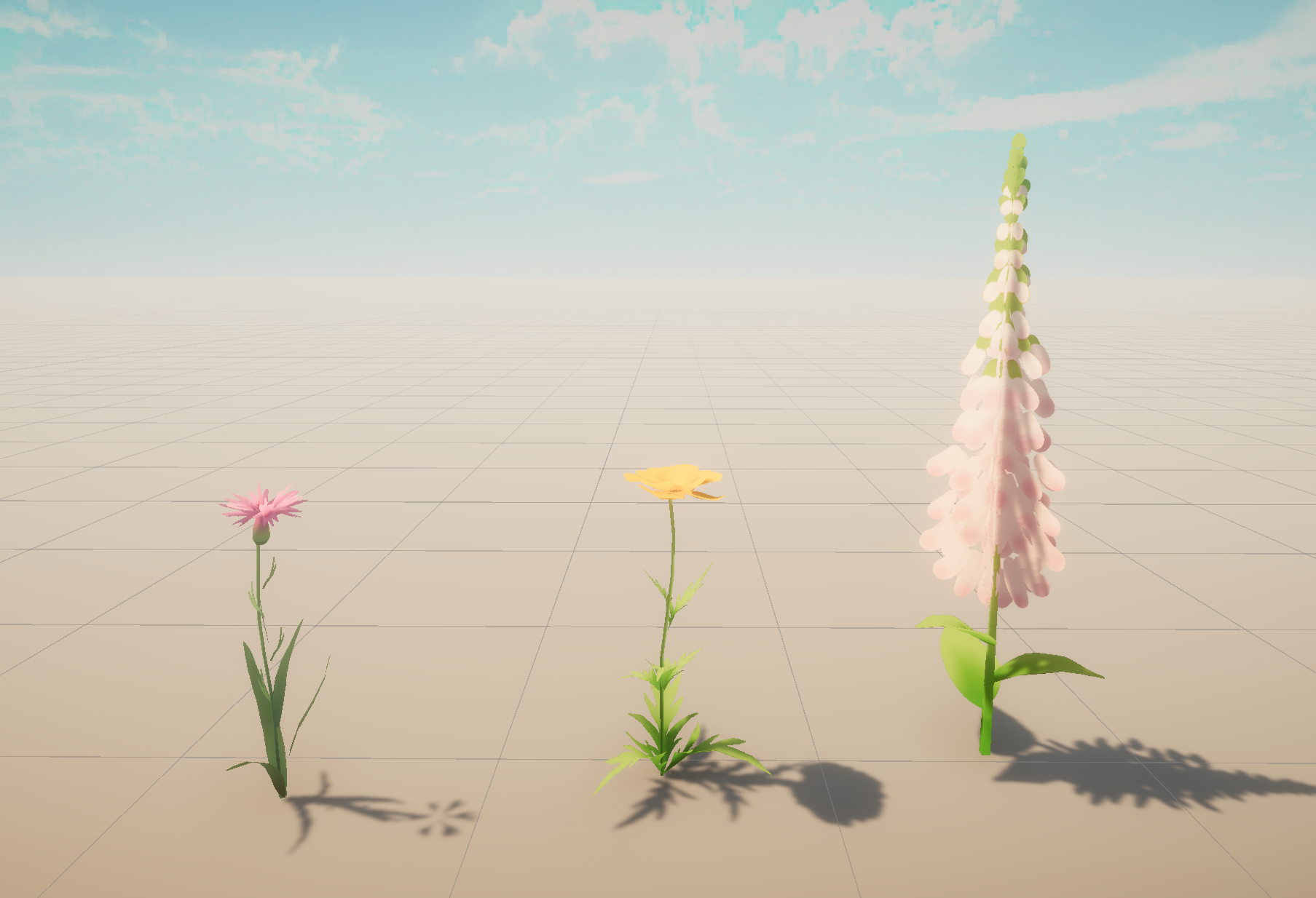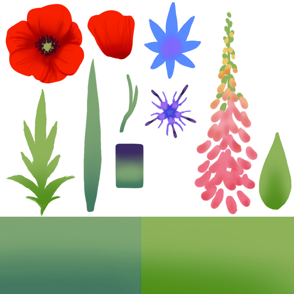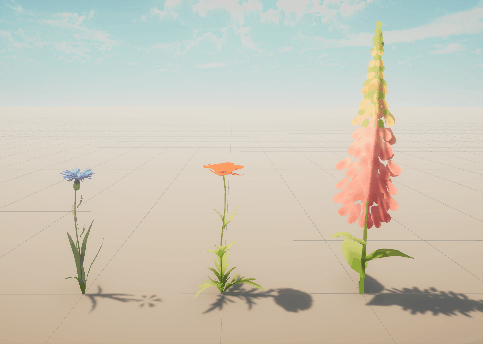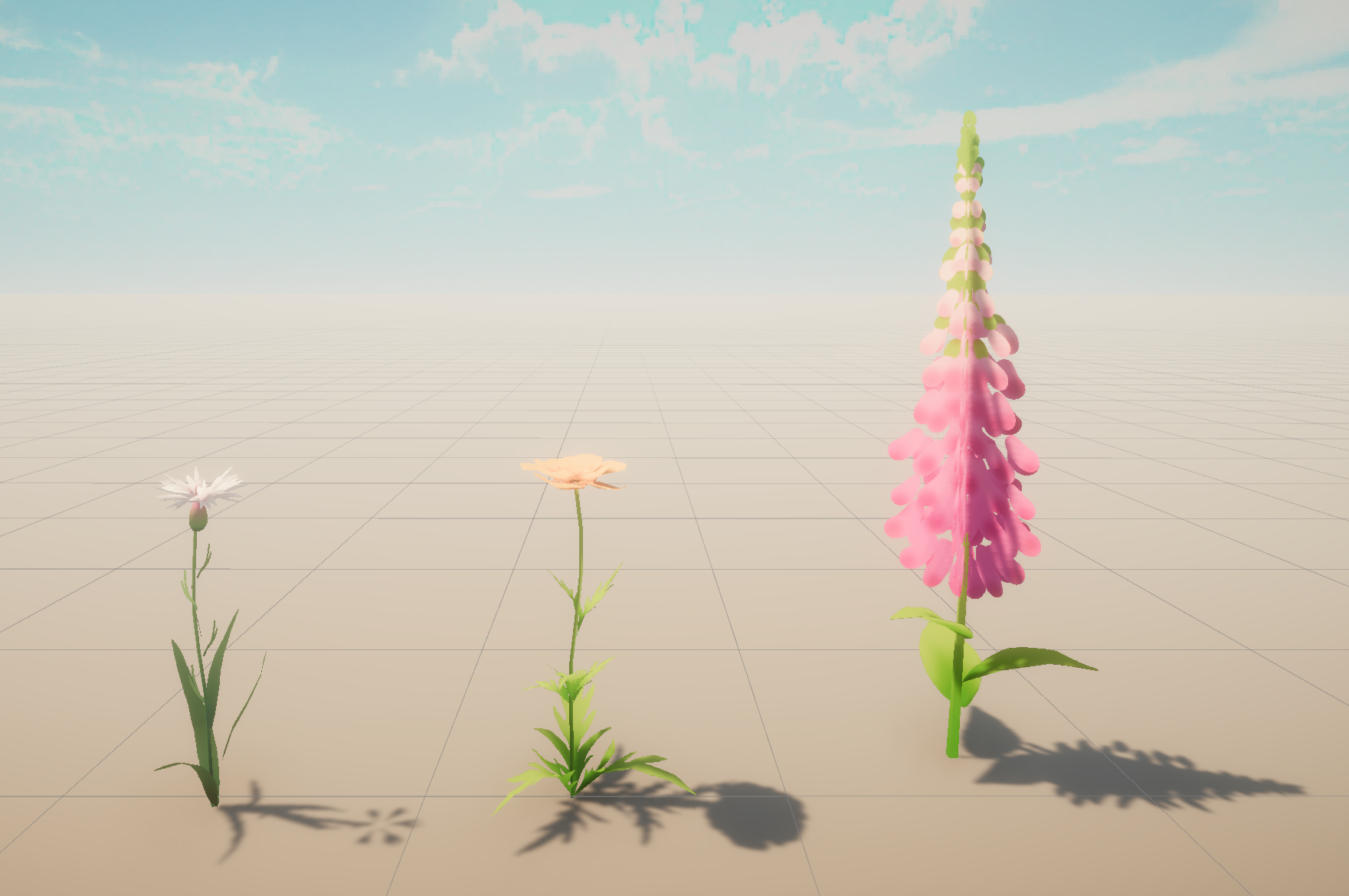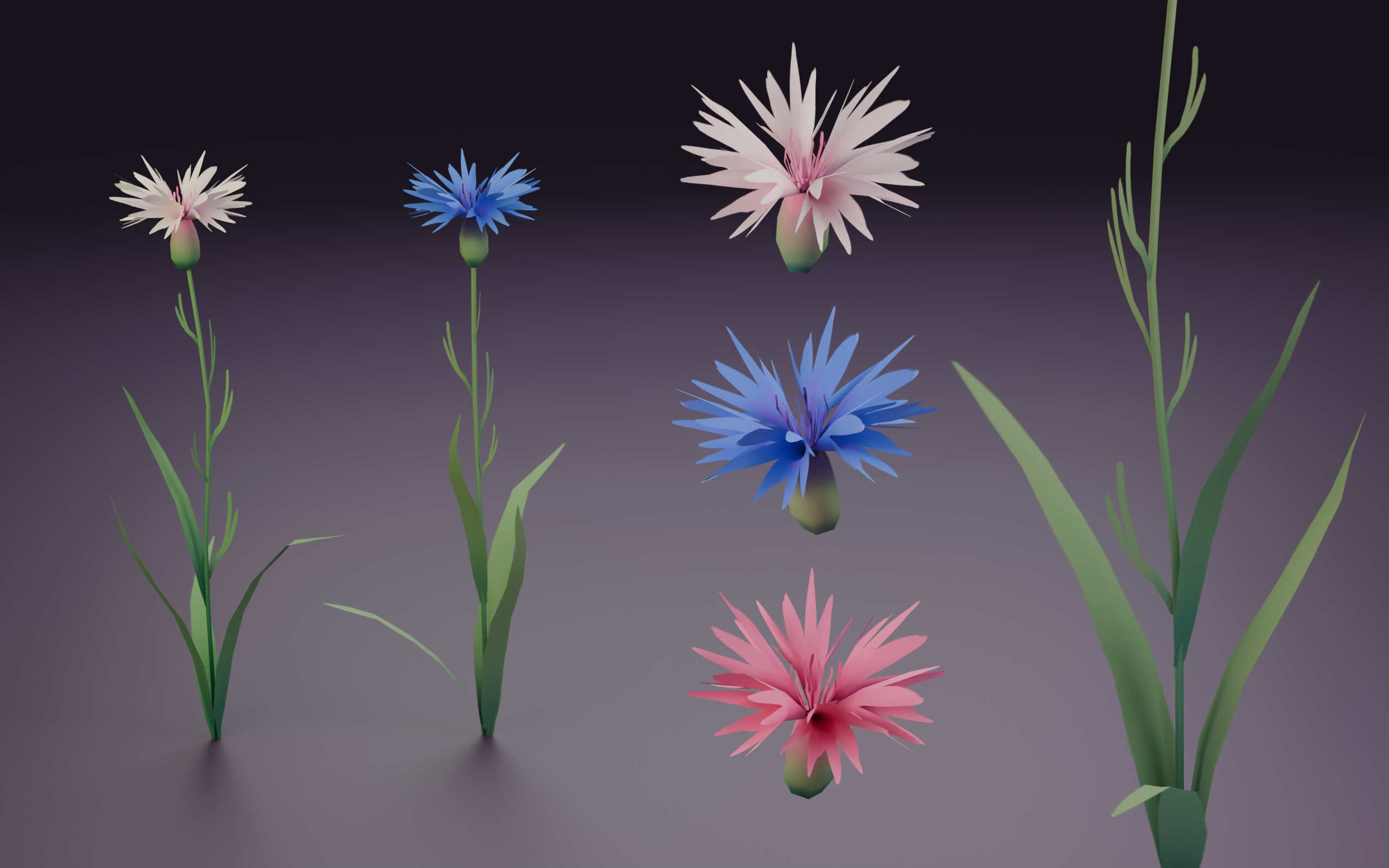 They are cornflowers, poppies and foxgloves. I referenced their irl species, but did not make these models accurate. I kept them stylized and generic.