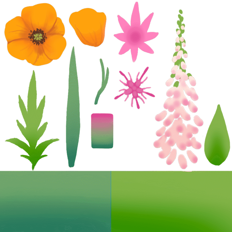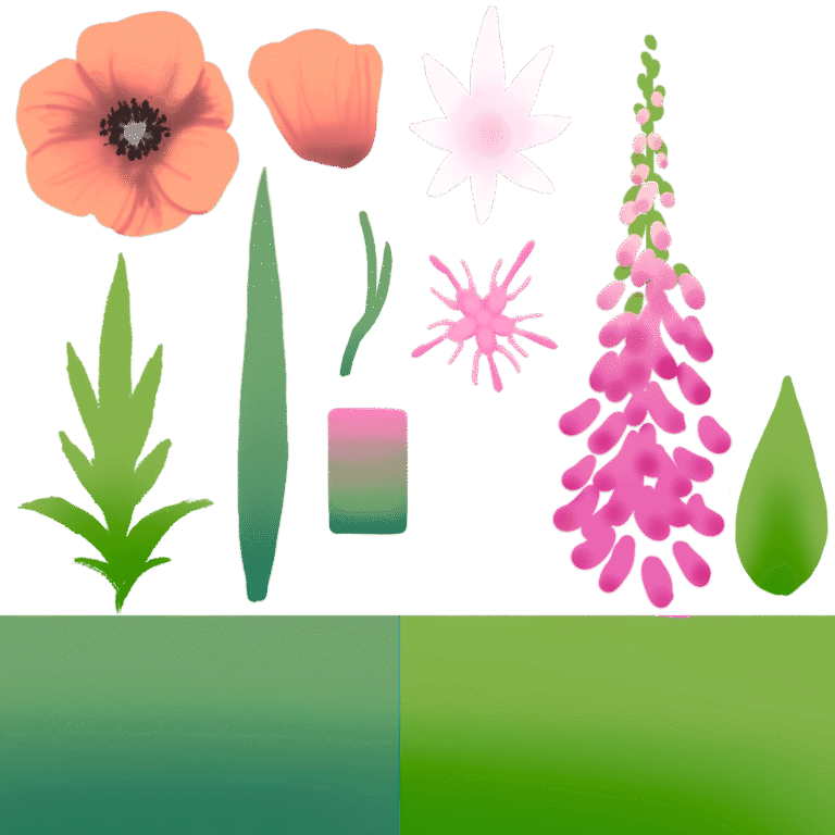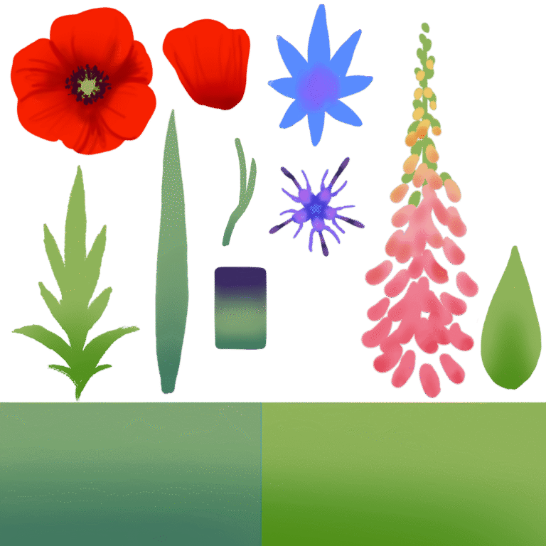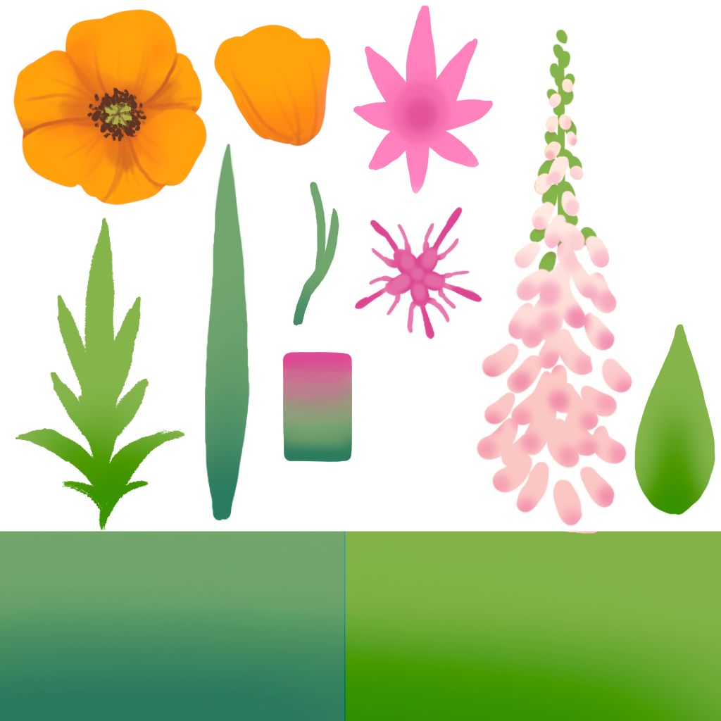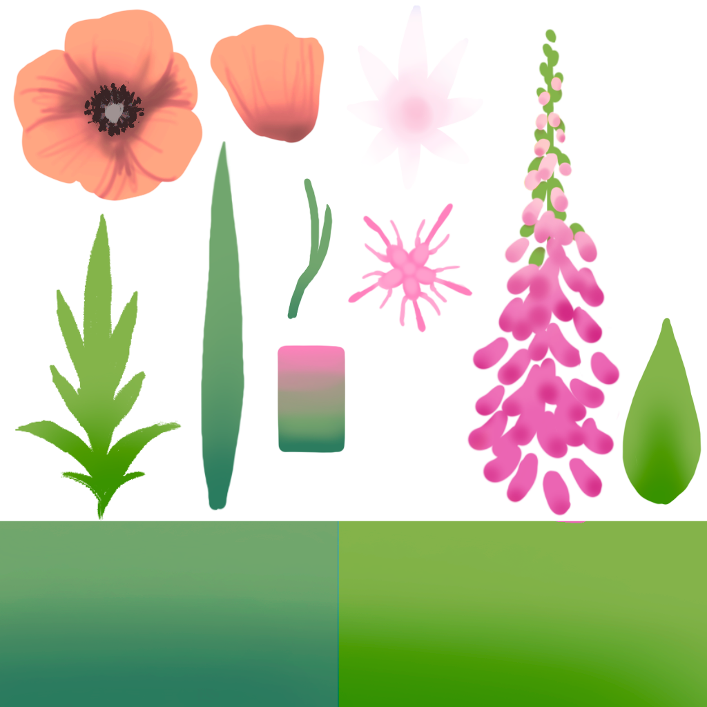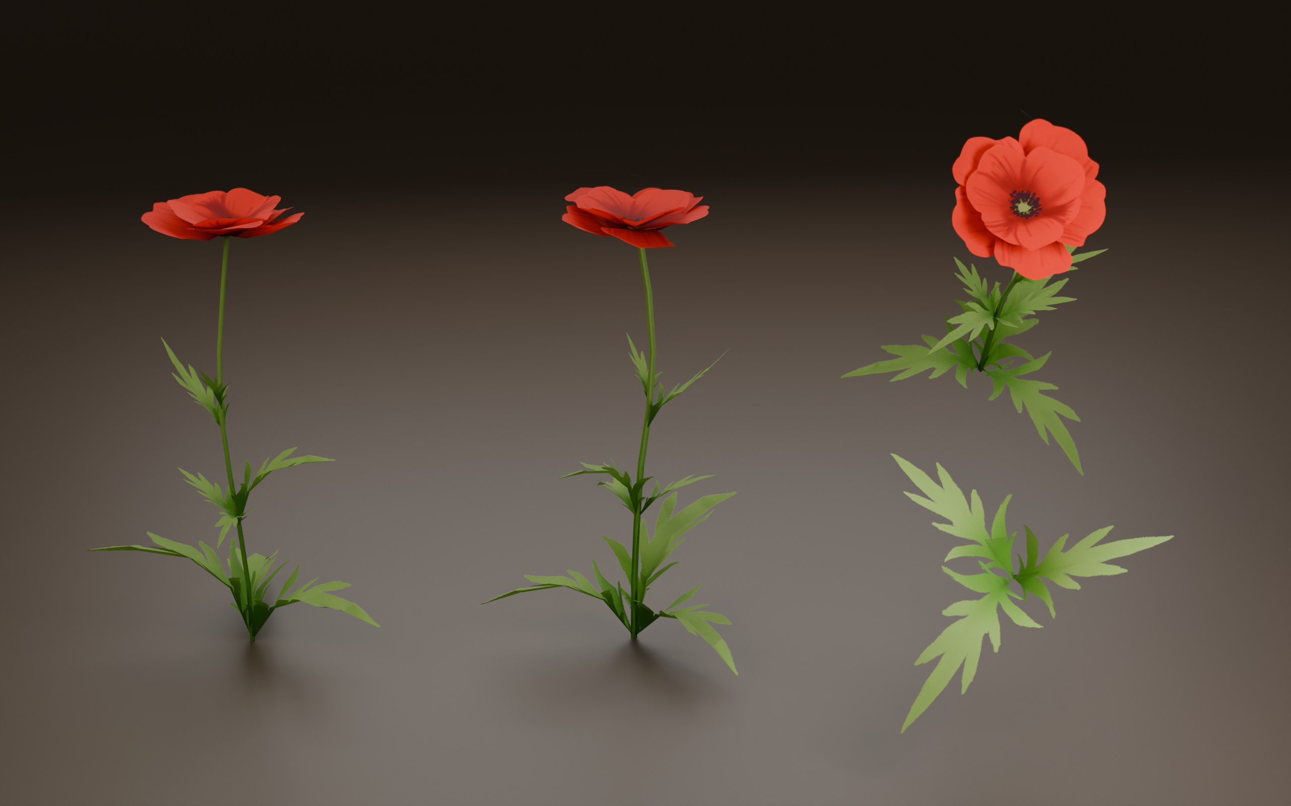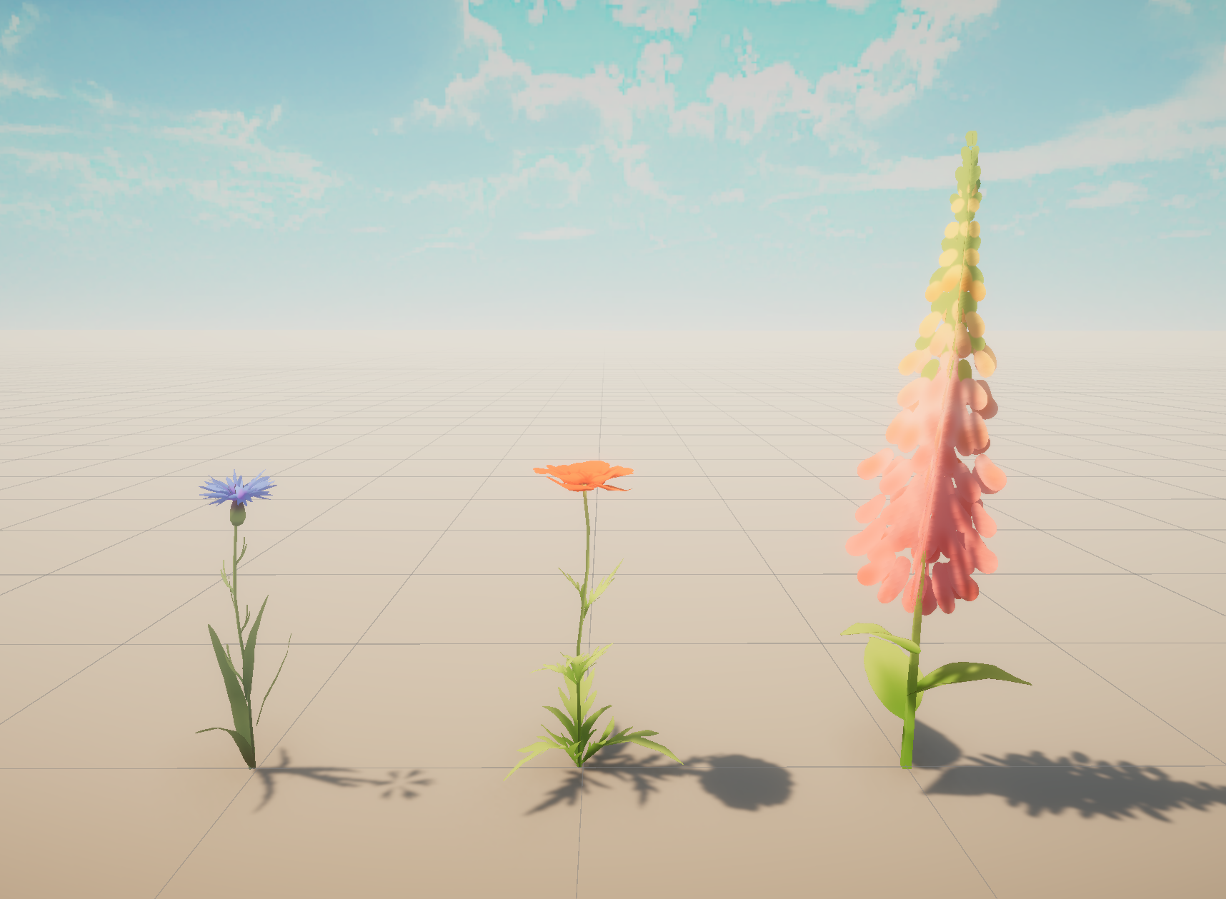 They are cornflowers, poppies and foxgloves. I referenced their irl species, but did not make these models accurate. I kept them stylized and generic.