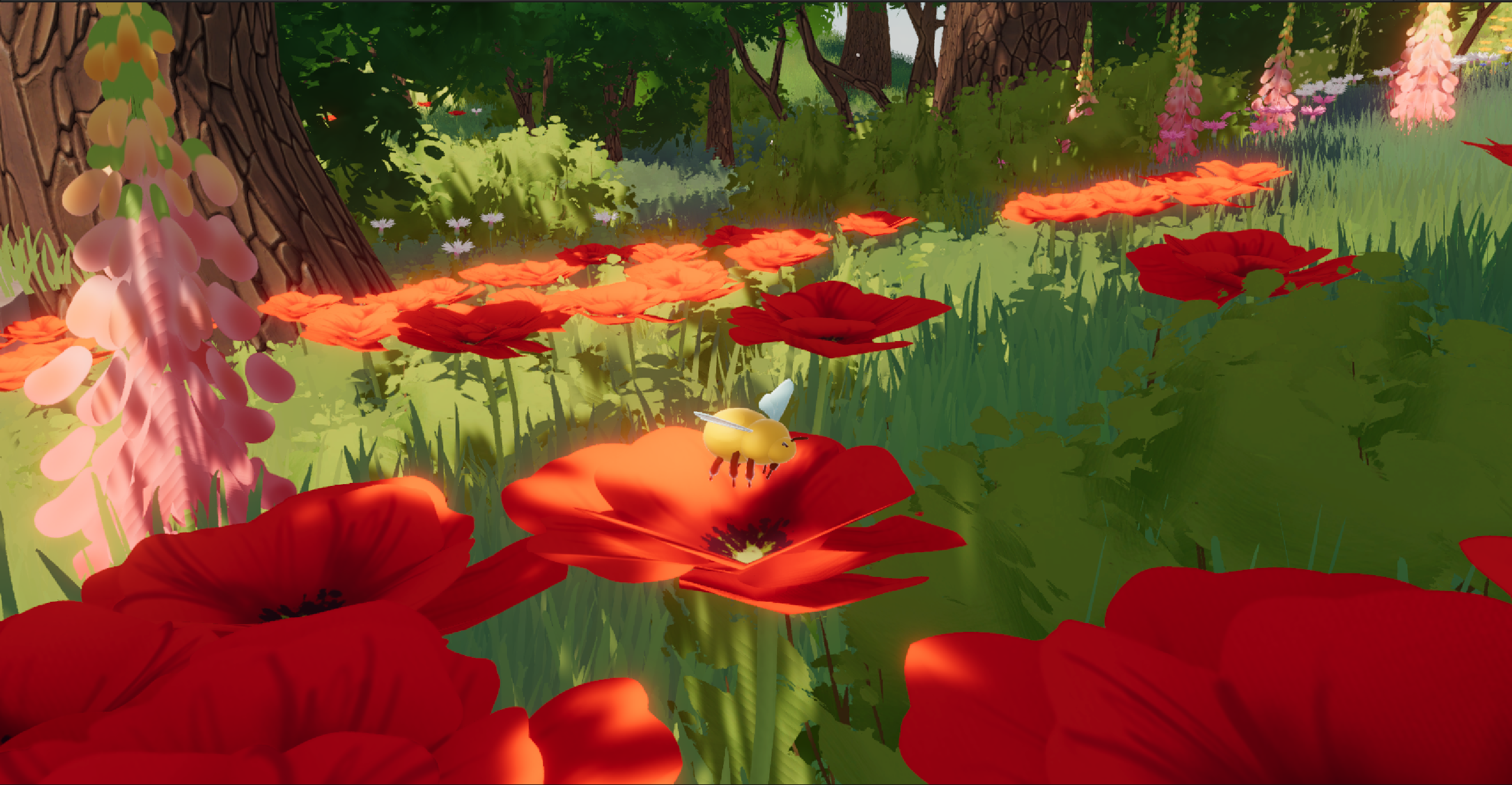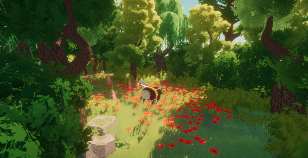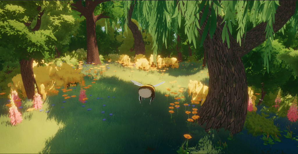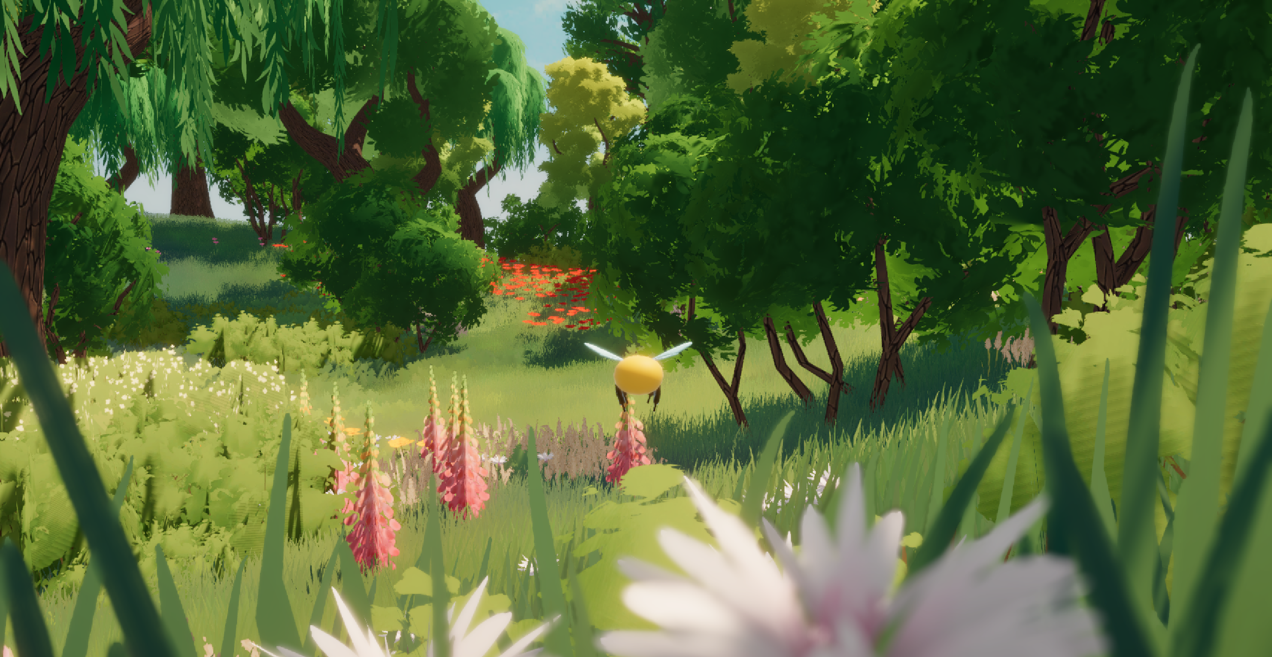 In this small environment project, you are a little bumblebee flying through cozy and lush greenery.