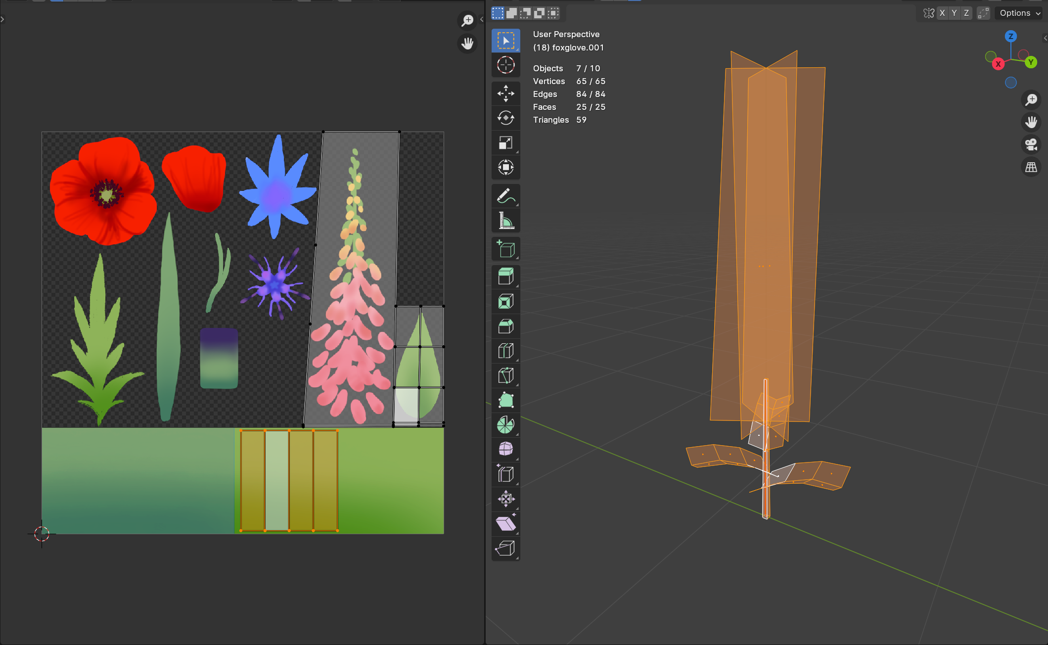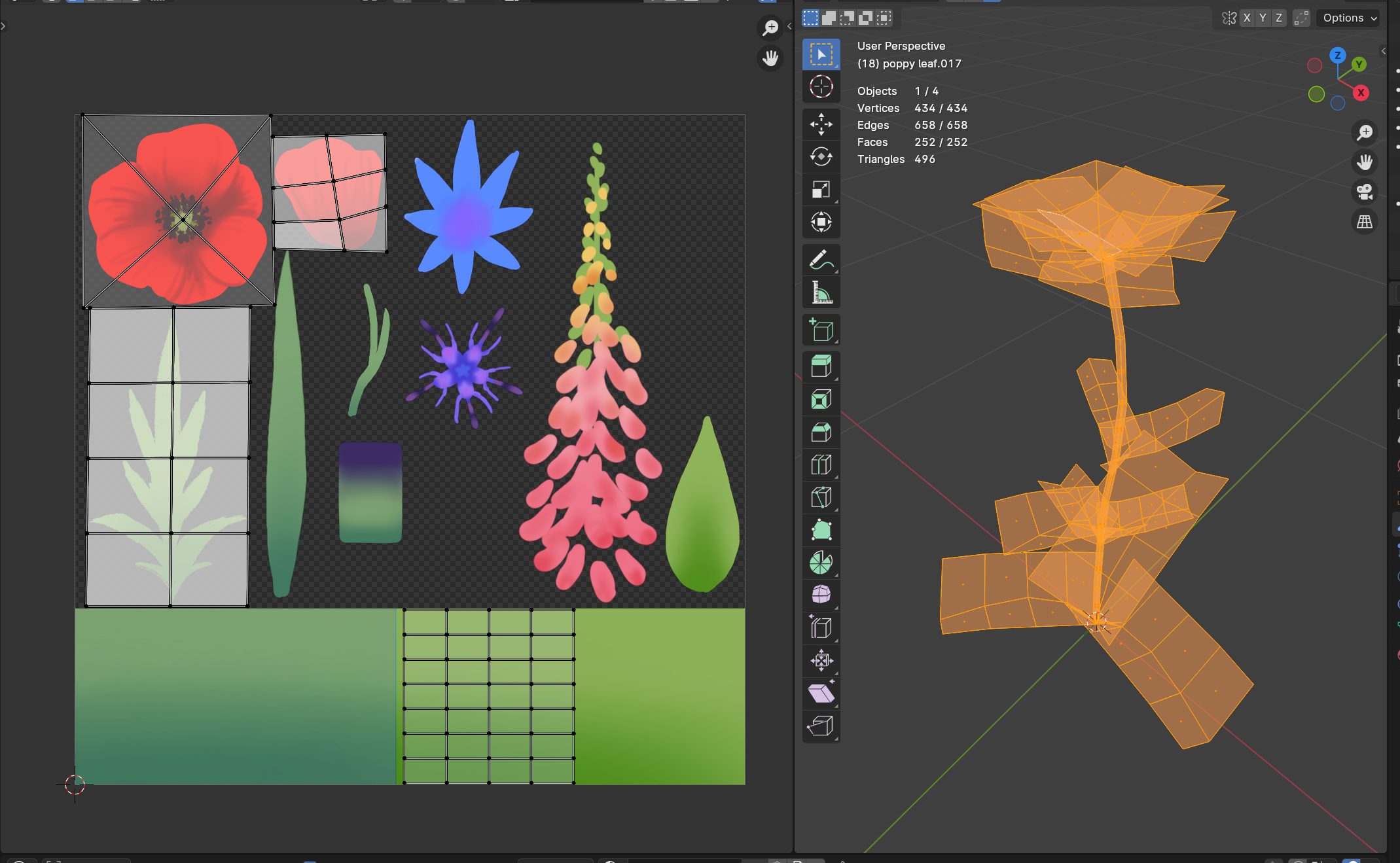 After handpainting the textures, I cut them out and modelled the planes to make a 3D mesh. This is the approach of Victoria Zavhorodnia, whose tutorial I used for the foxglove. After figuring out the workflow, I worked on increasingly harder shapes to figure out the limits of this workflow. The cornflower has a peculiar structure, and it was a fun puzzle to figure out how to make it 3D from a flat texture.