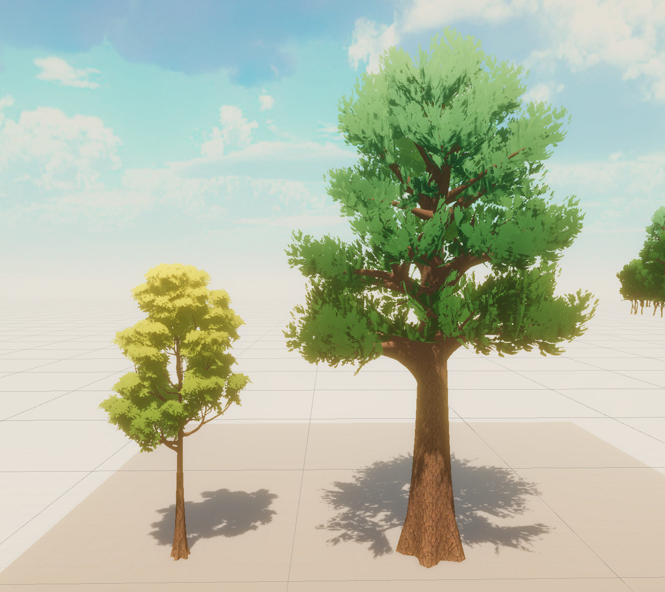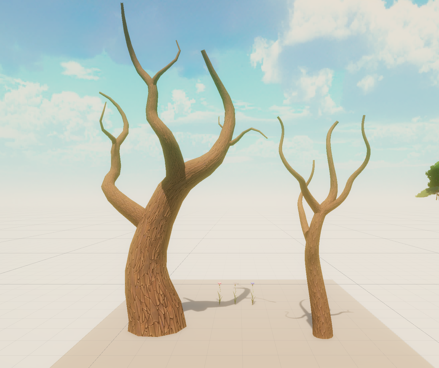 I made the trunks with blender curves to have more control over the shape. When making the shape, I payed attention to a diverse silhouette when you would rotate the tree. The generated trunks looked the same with every rotation, boring!