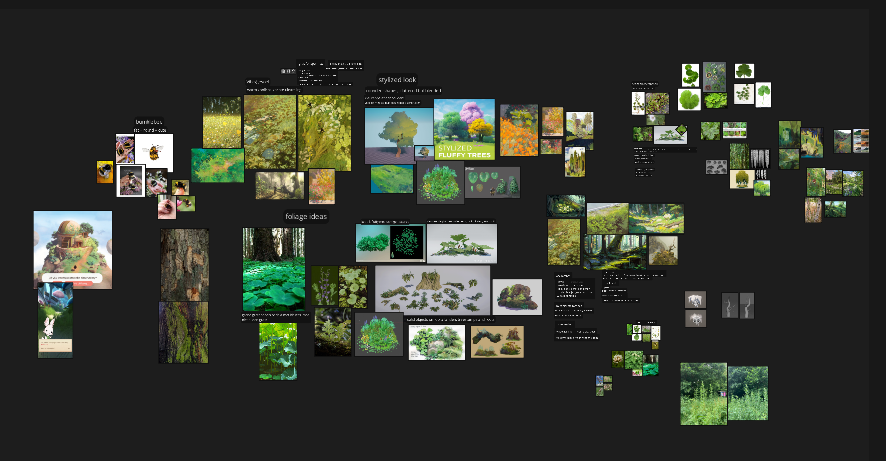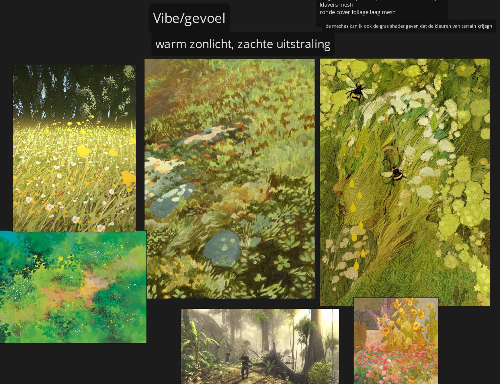 In my moodboard, I gathered images to capture the feeling of warmth i was going for, as well as style references, environment layout ideas and, of course, foliage ideas and references.
